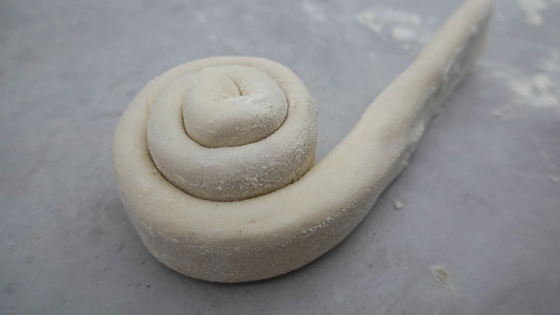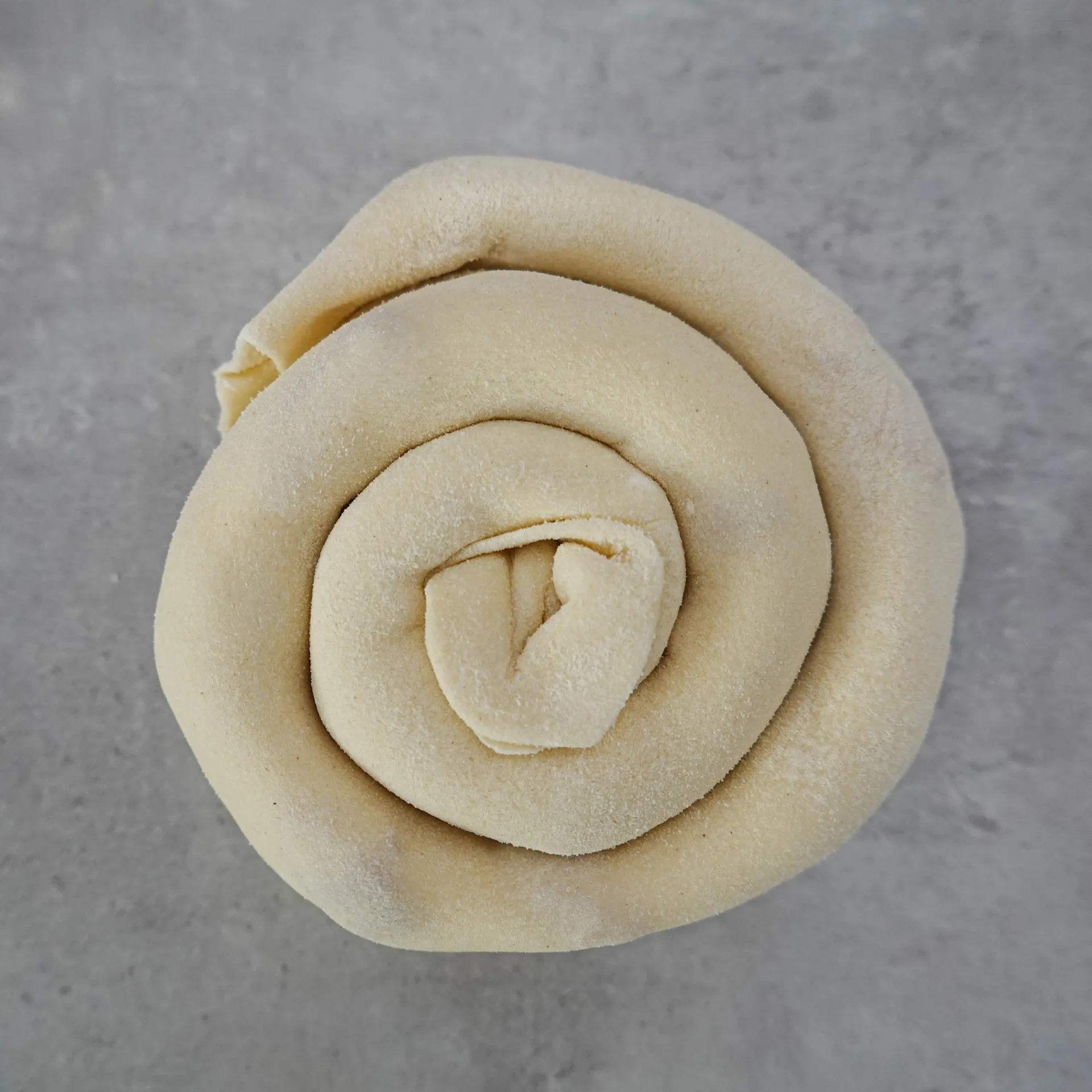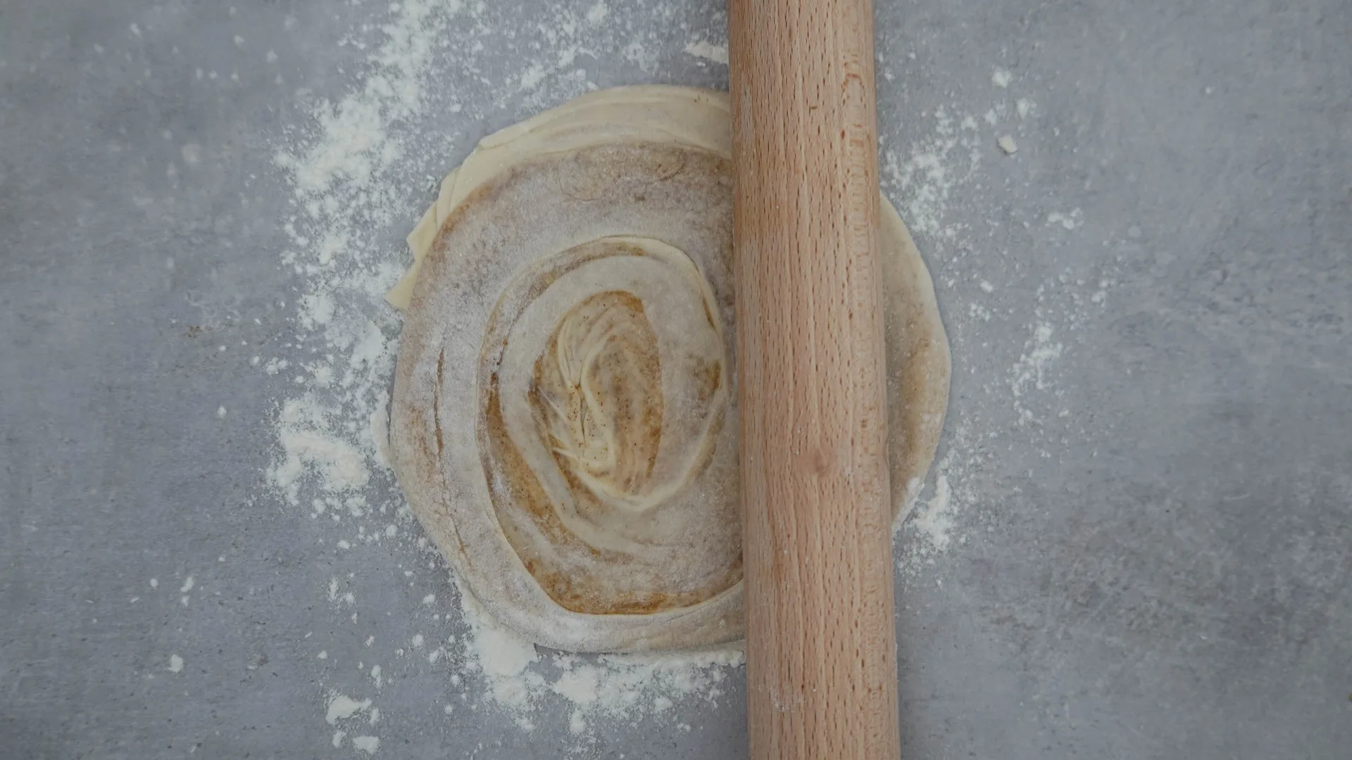 We divide the dough into equal parts and roll it out. The thickness of the dough is crucial here, it is about 2 mm, not thicker. For the French roll variant, we spread liquid butter on the rolled out dough. Then we sprinkle cinnamon and sugar on the butter. We now beat the dough together horizontally and then twist it into a snail. We press the snails together and roll them out 1- 1.5 cm thick. The resulting Chinese Pancakes can now be baked and eaten directly in the pan.