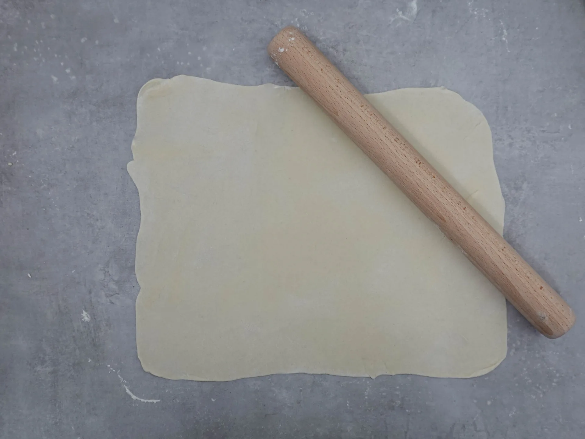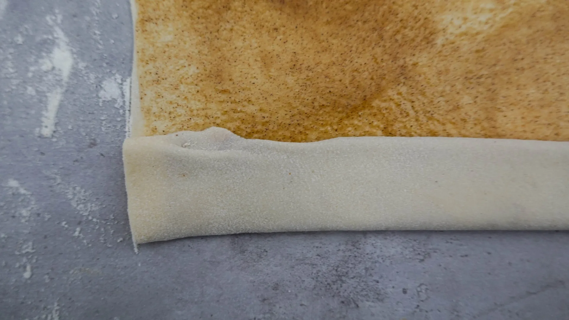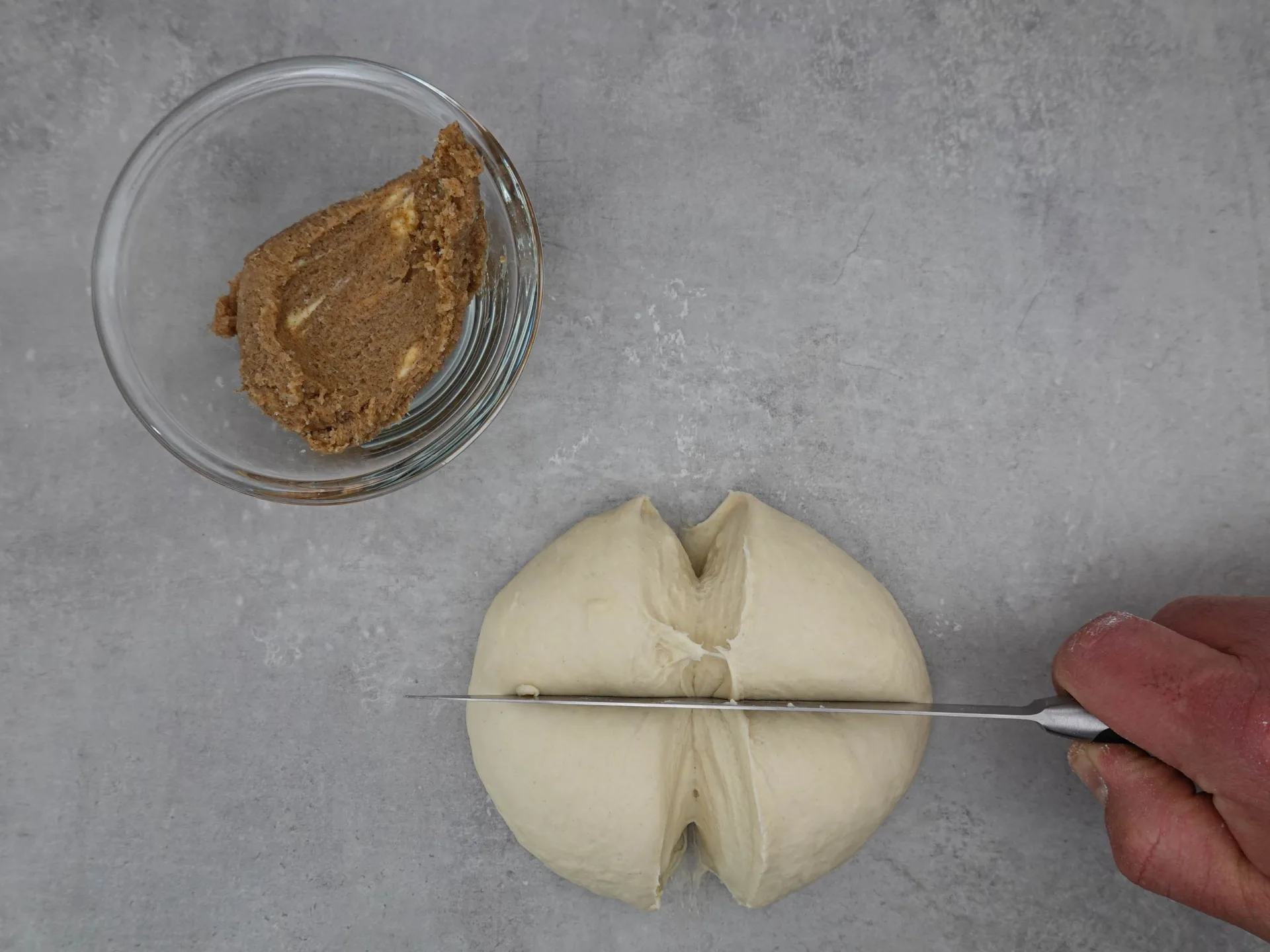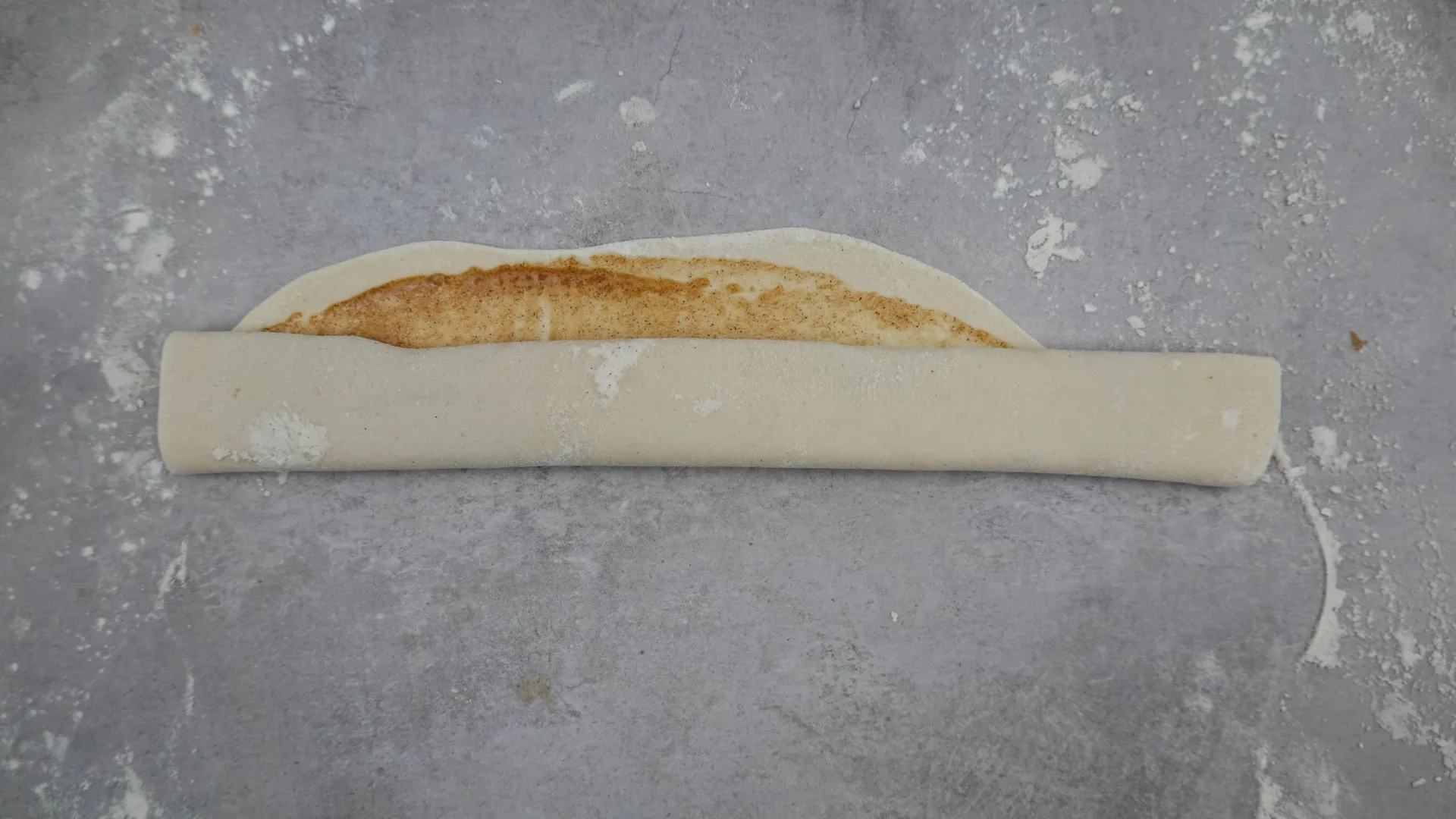 We divide the dough into equal parts and roll it out. The thickness of the dough is crucial here, it is about 2 mm, not thicker. For the French roll variant, we spread liquid butter on the rolled out dough. Then we sprinkle cinnamon and sugar on the butter. We now beat the dough together horizontally and then twist it into a snail. We press the snails together and roll them out 1- 1.5 cm thick. The resulting Chinese Pancakes can now be baked and eaten directly in the pan.