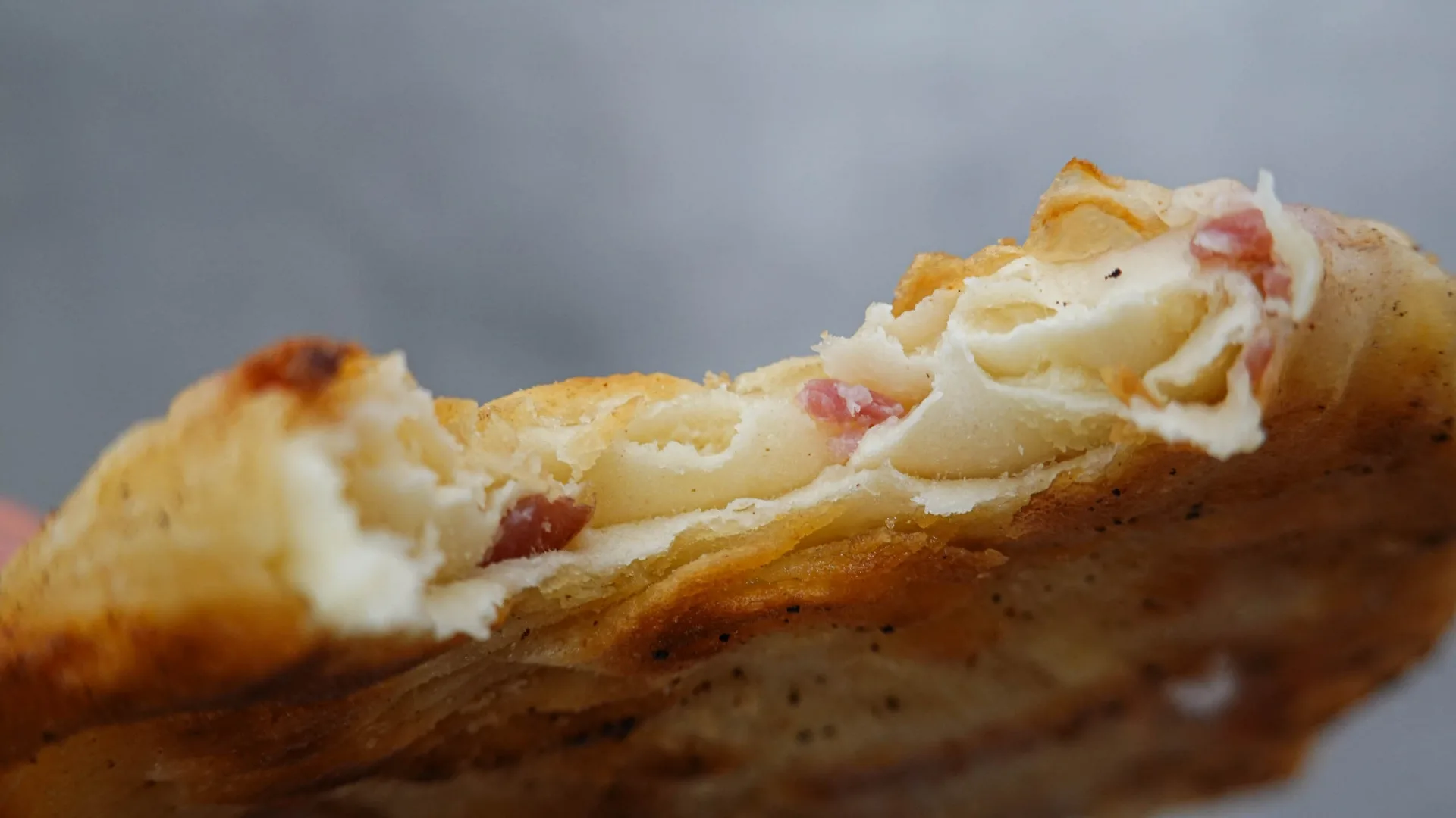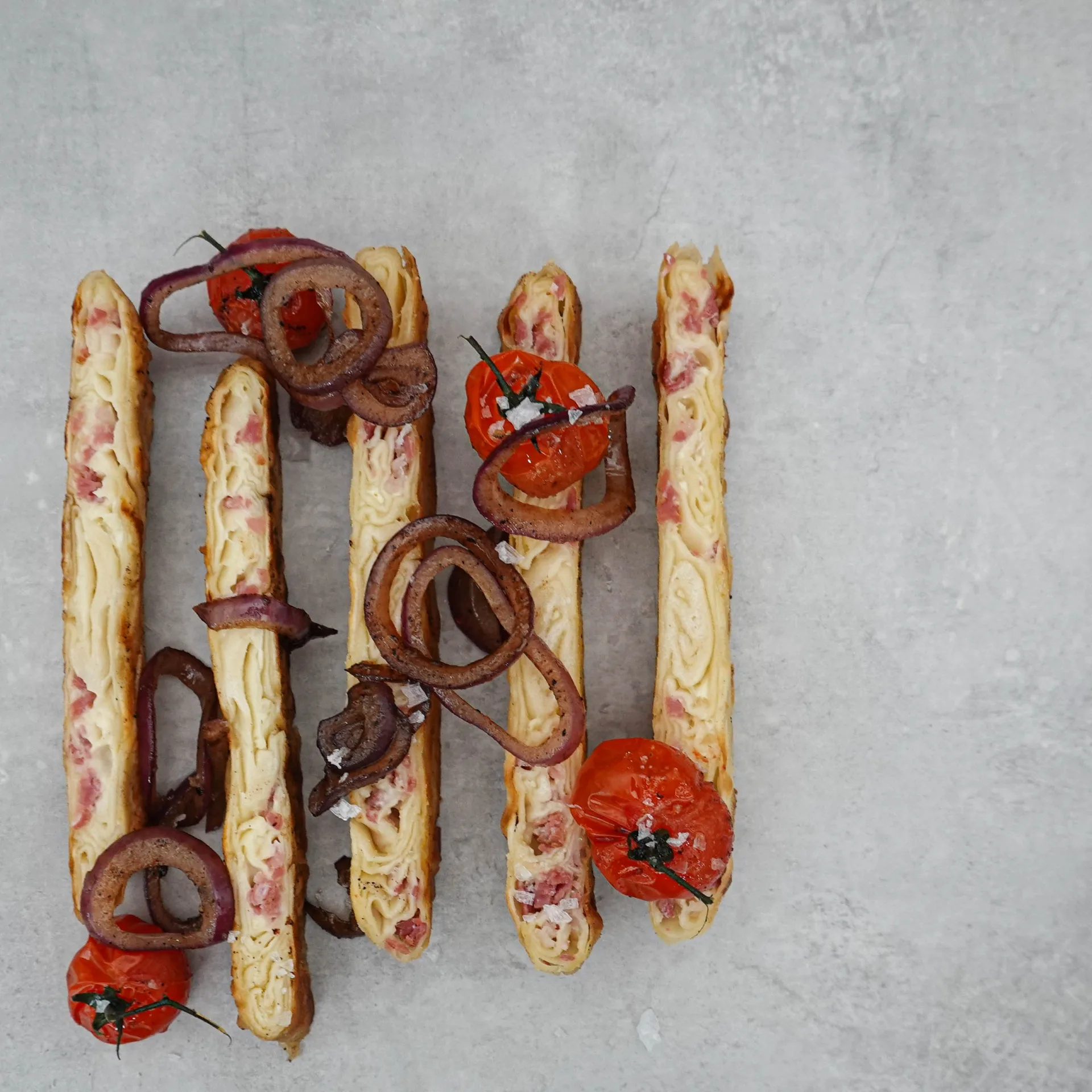 However, we do not follow the classic recipe for Chinese flatbread, but combine this base with ingredients from French rolls, tarte flambée and pea soup.