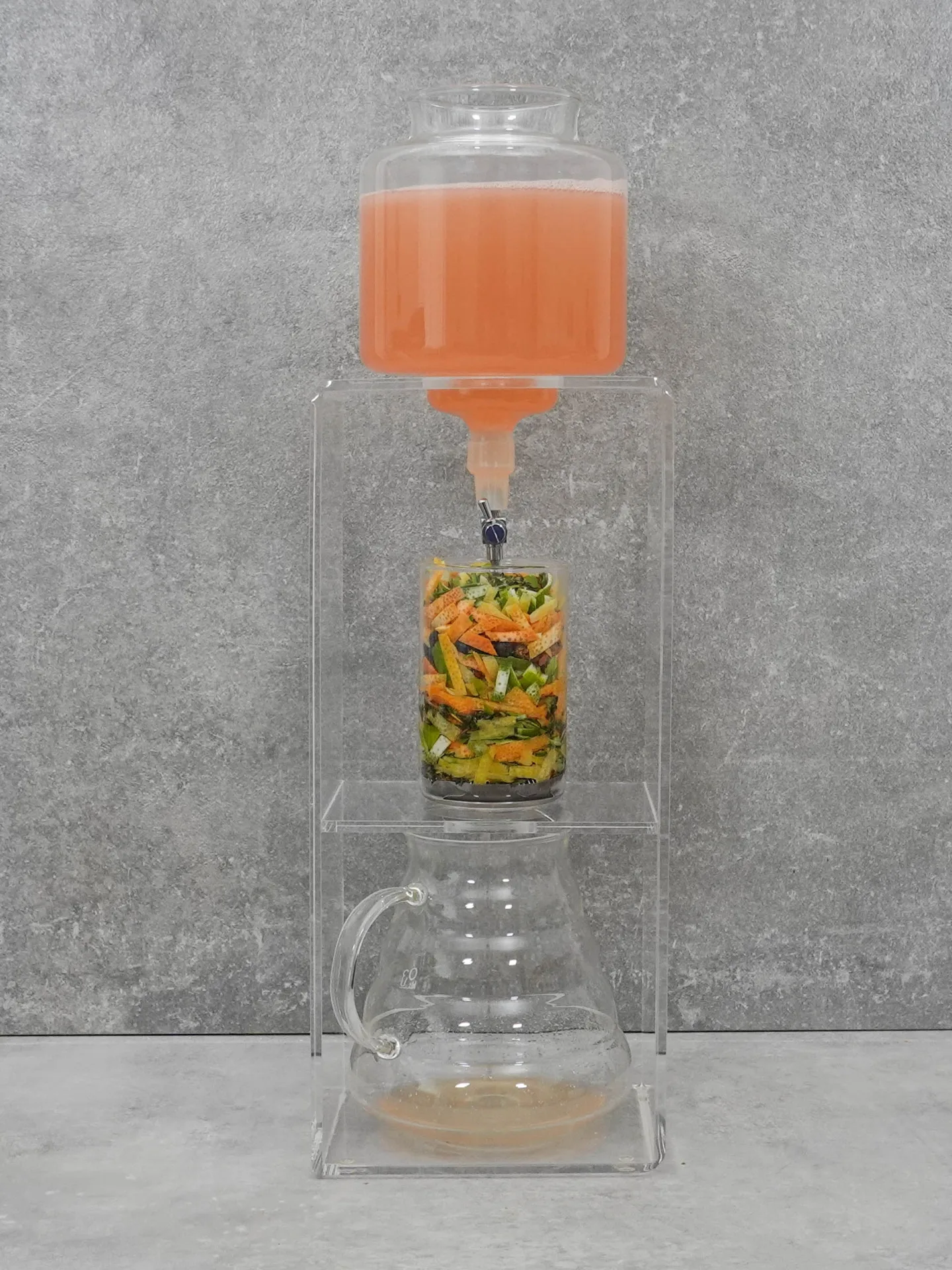 For the tonic syrup, we peel limes, lemons and grapefruit. The peels are coarsely chopped. Rosemary and thyme we also chop. We layer the citrus peels and herbs with juniper and cinchona bark in the filter of the cold brew machine. Despite the hot coffee, this is now used for the tonic. The pulp of peeled lemons, limes and grapefruit we juice and “brew” it cold. To intensify the taste of our “Cold Brew Juice”, we add fresh, finely chopped rings of lemongrass to the pot. We leave the juice to cold brew for a total of 24 hours. During this process, the brew passes through the filter three times. After each run, we taste the brew. It becomes more intense from time to time and the cinchona bark, in combination with the peels, brings a distinct bitterness to the juice.