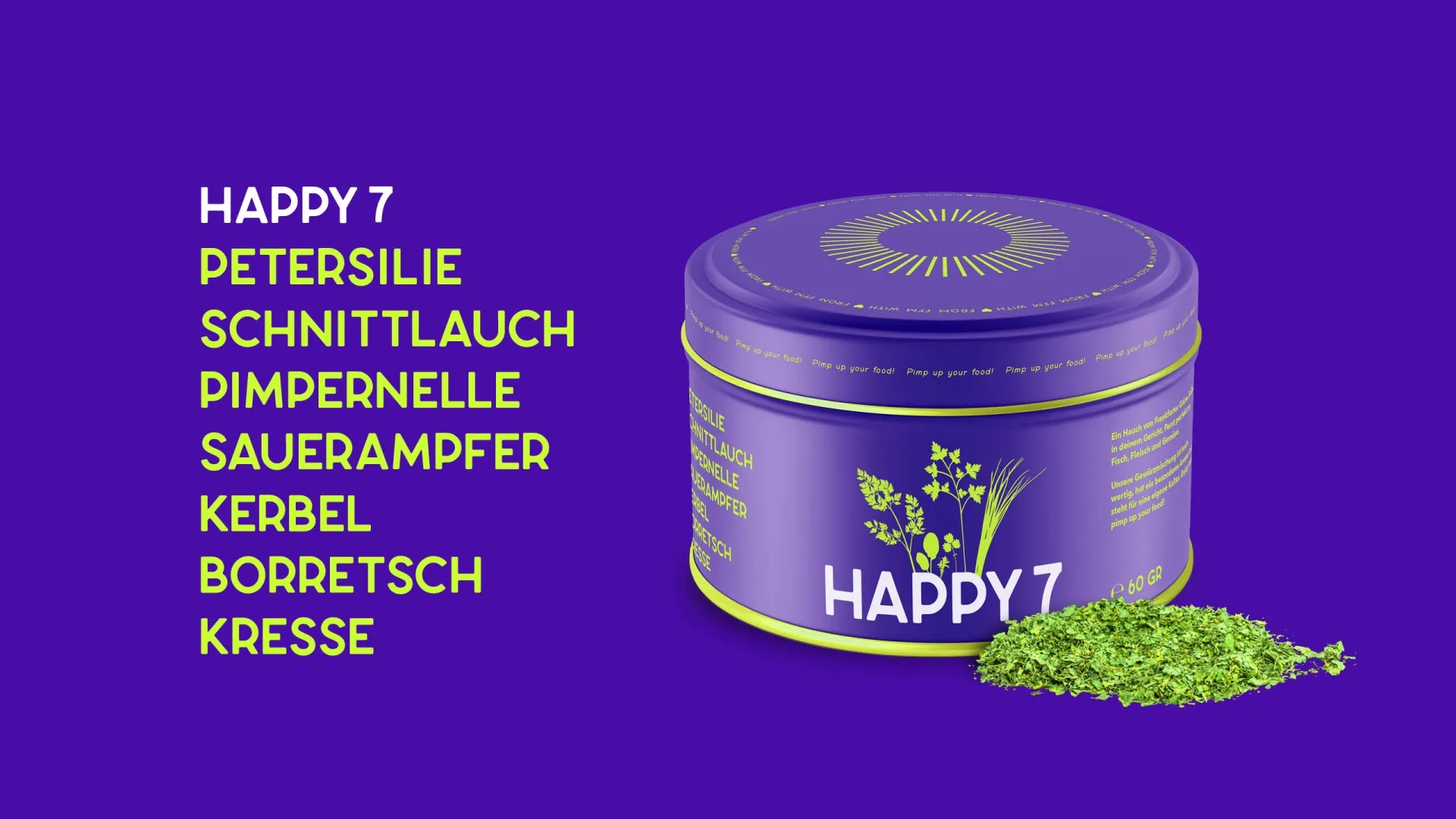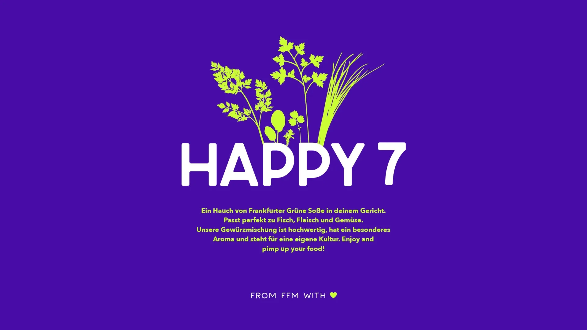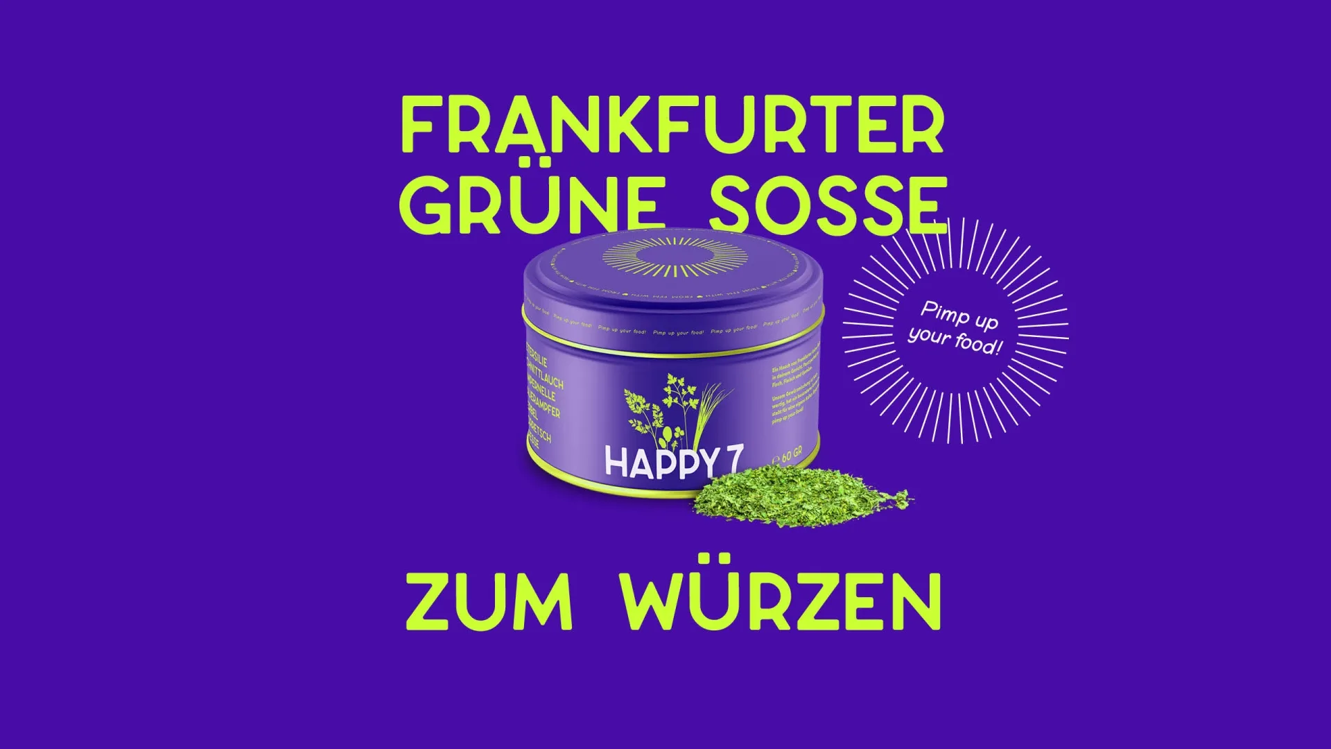 We have made the Frankfurt Green Sauce available for every day. The Food Lab has created a versatile condiment: 100% flavor, 100% dry, 100% FGS. This product makes happy. That’s why we simply christened it “Happy 7”.