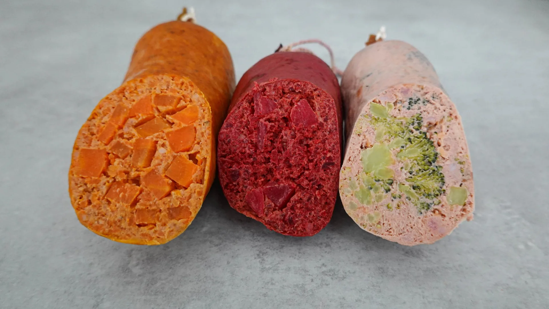 So we combine a classic lyoner or meat sausage (a boiled sausage) with vegetables and make a vegetable lyoner in different variations.