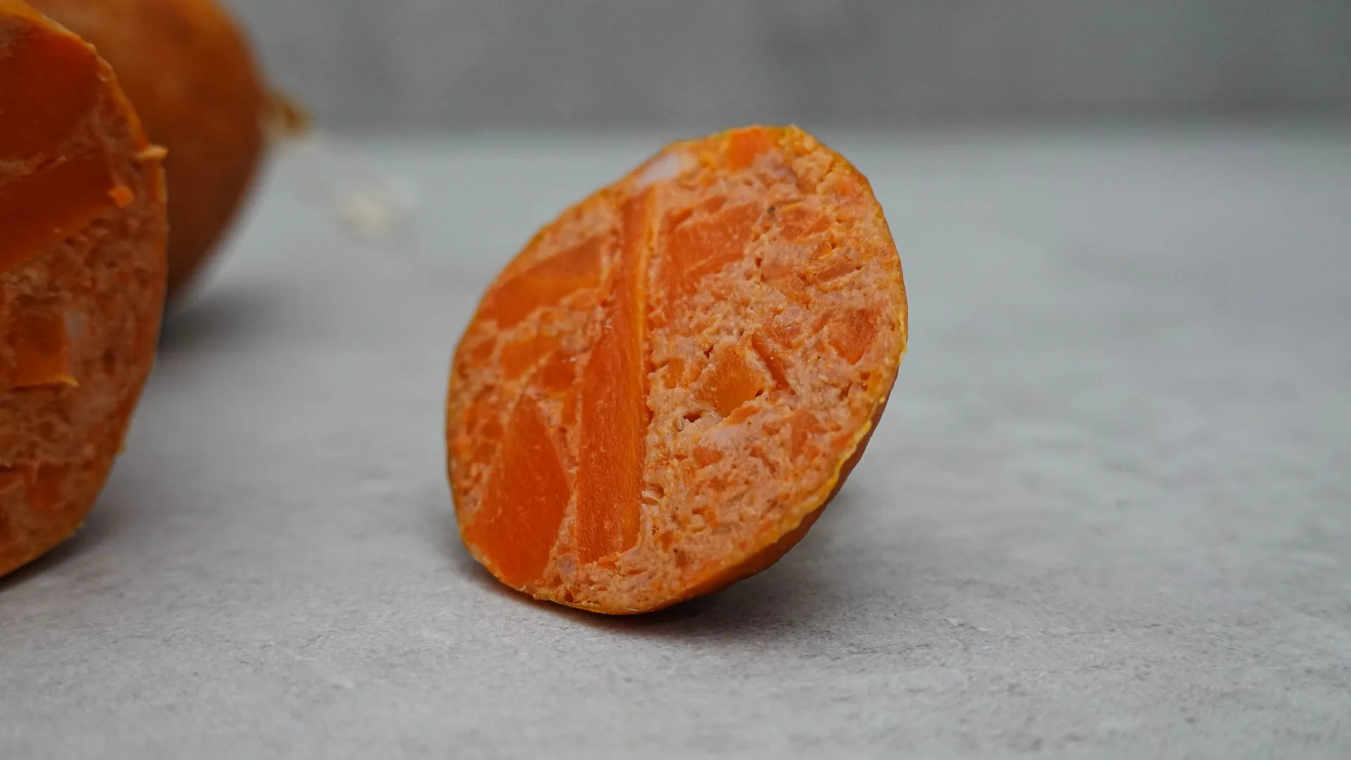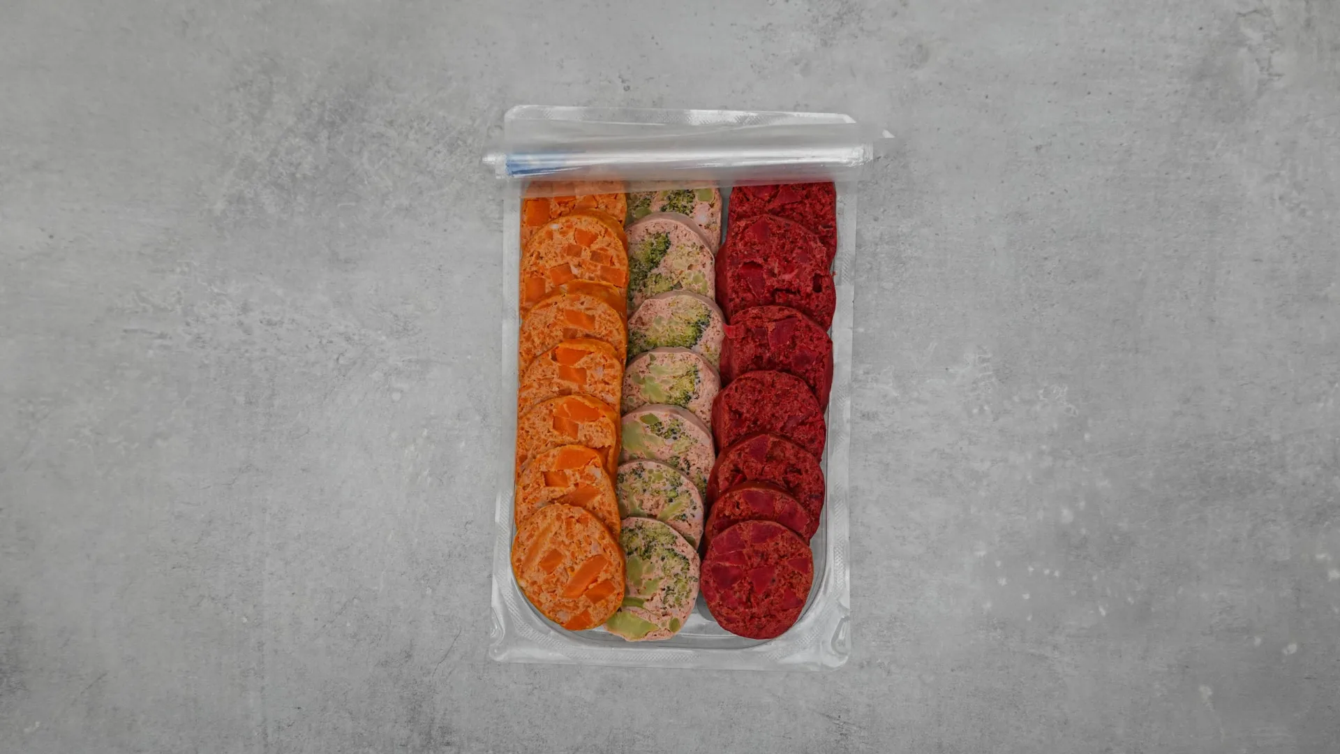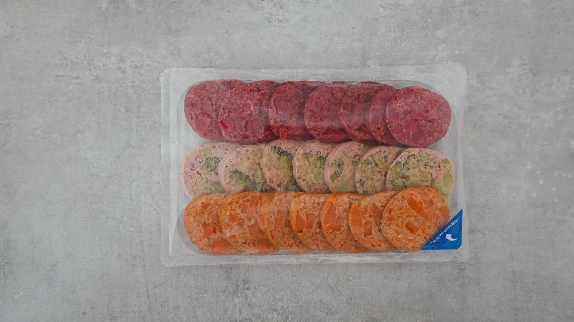 So we combine a classic lyoner or meat sausage (a boiled sausage) with vegetables and make a vegetable lyoner in different variations.