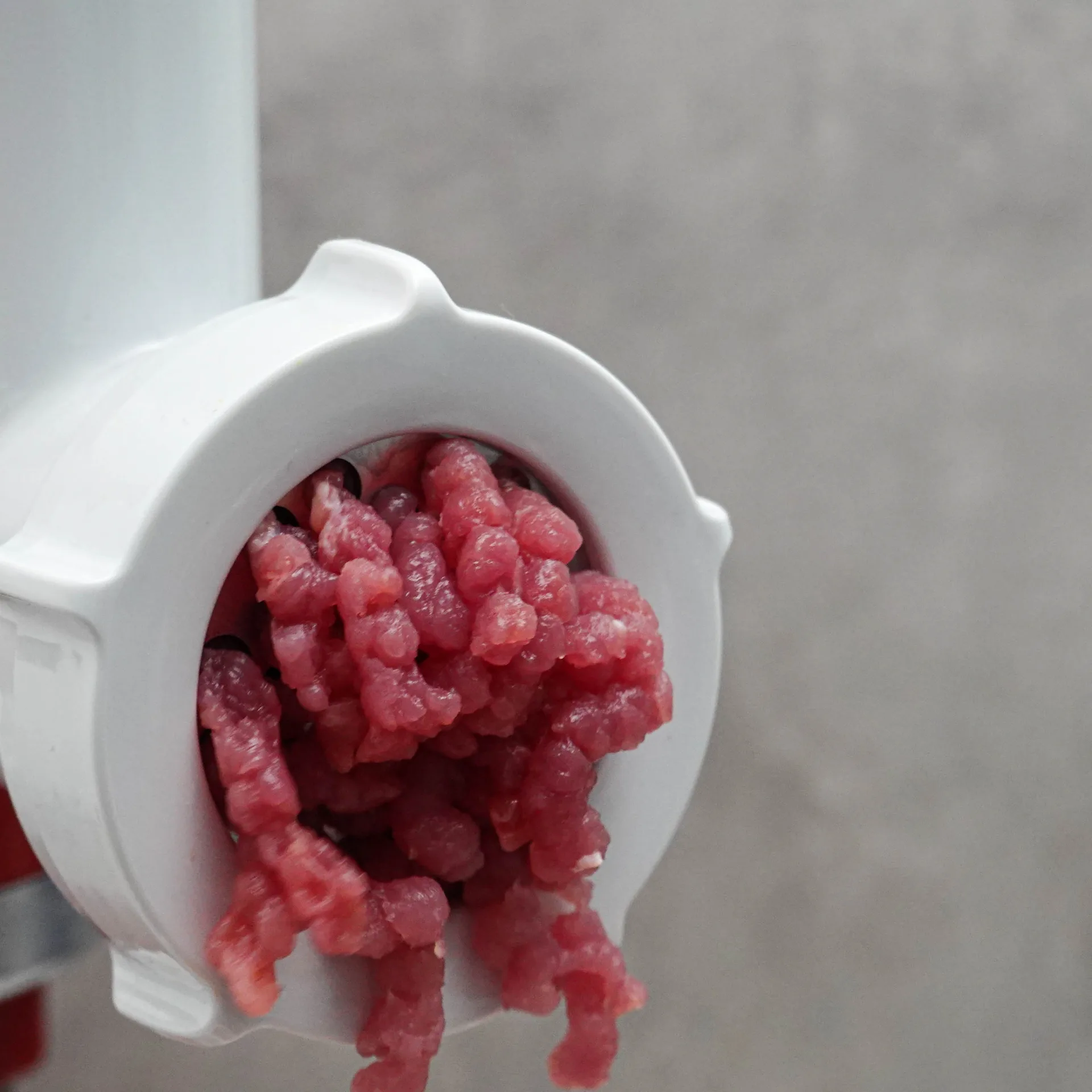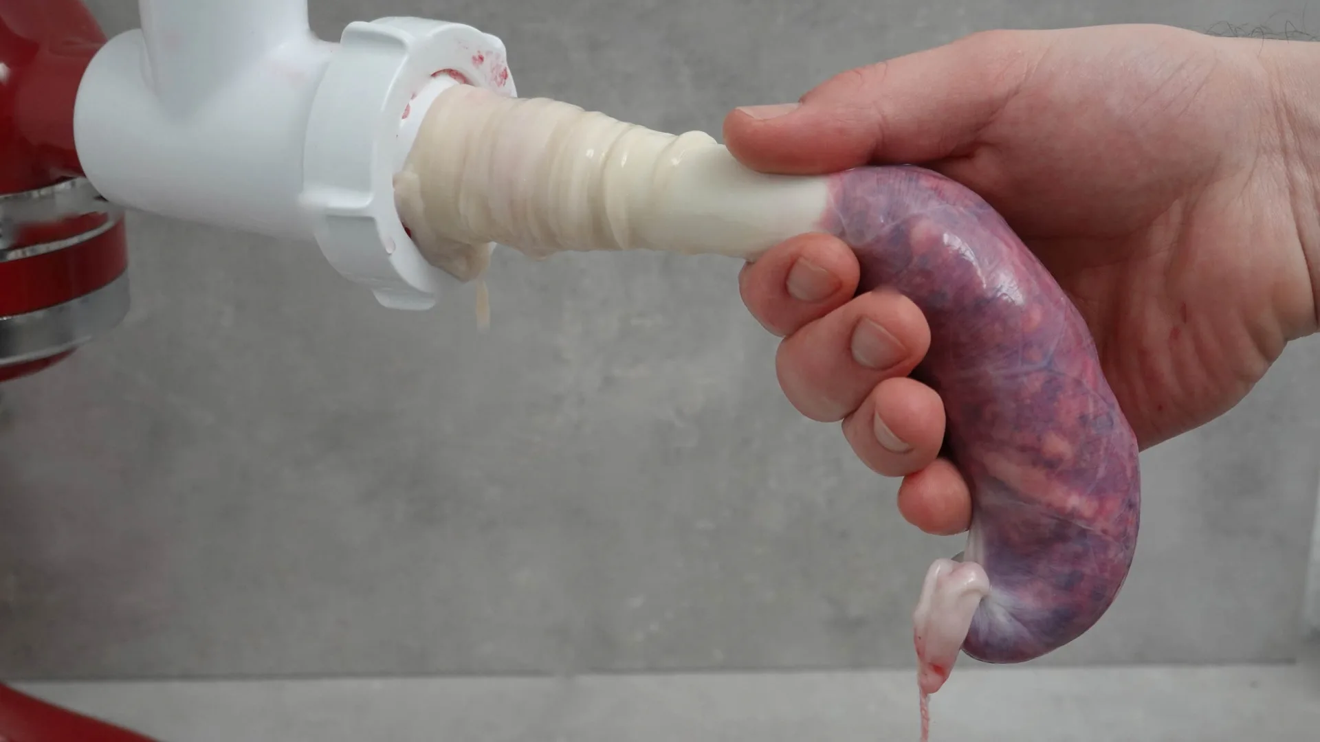 Arriving at the Food Lab, we first prepare our vegetables. We clean the beet and celery with a soft vegetable brush, remove the stems and roots and cook the beet and celery in the oven at 180 degrees for one hour. This reduces the moisture and concentrates the flavor. The carrots, on the other hand, we blanch briefly, so they remain crunchy and retain a bright color. Clean the broccoli into florets and set aside. For the sausage mixture, we parry the pieces of meat and cut them into 2×2 cm cubes. We let the cubes freeze at -18 degrees, this is important because heat is generated in the meat grinder. This heat coagulates the protein, which we need for binding. The meat takes about 20 minutes to freeze, then we turn the meat through the grinder. After that, we cool it again. For the sausage we use spices such as coriander seed, paprika powder, ginger, marjoram and pepper. To get the color we take citric acid and pickling salt to help, both prevent the meat from turning gray.