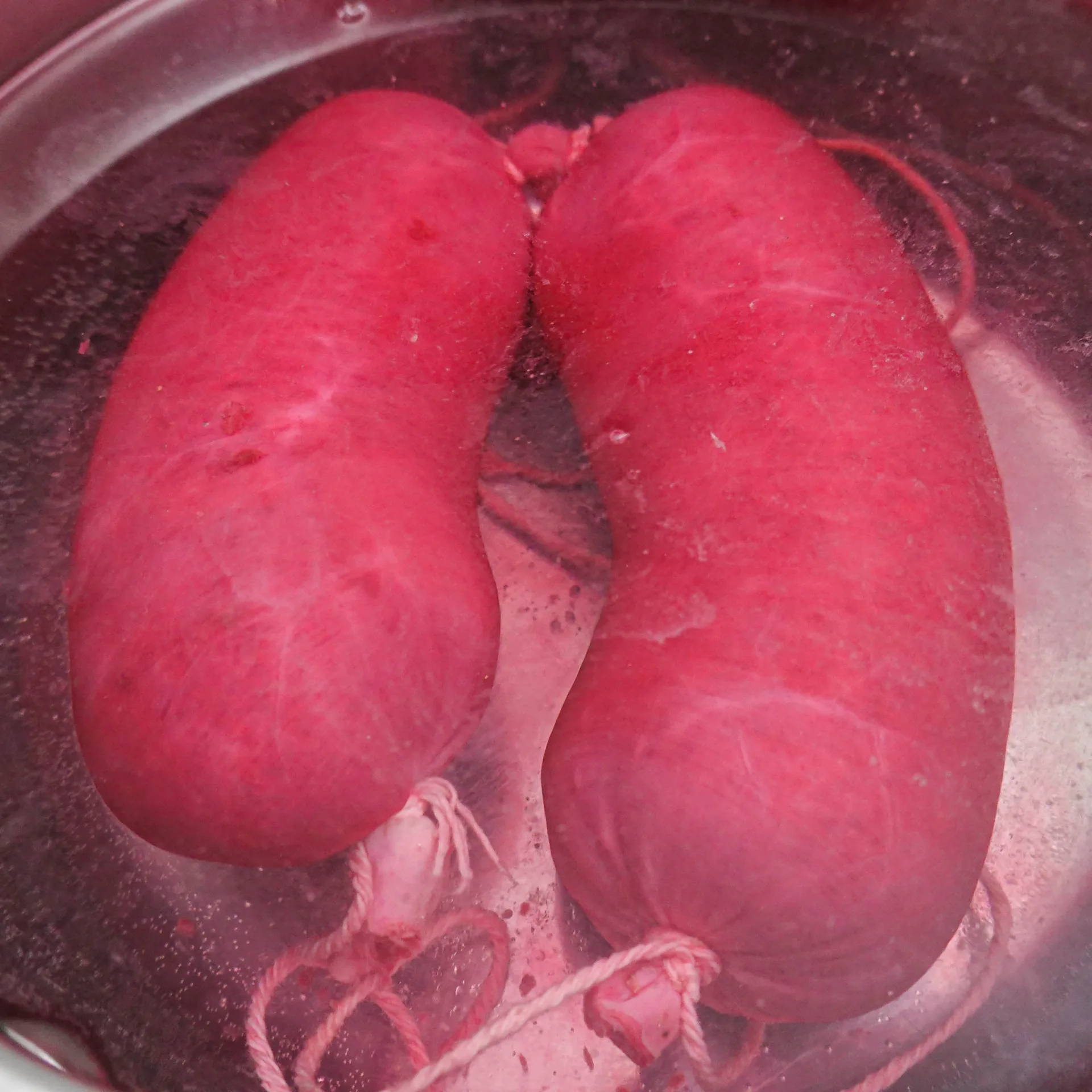 After an hour, we quench the sausages in ice water and leave them to dry overnight. This way, the casings contract a little more and keep their shape. When cut, the result shows: a beautiful coloring, a beautiful cut and taste each sausage has its own peculiarity.