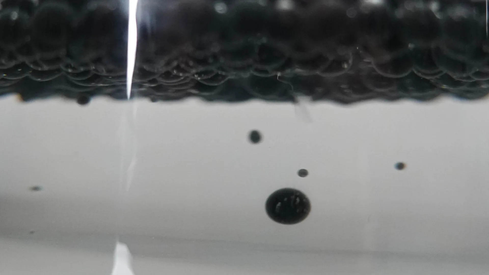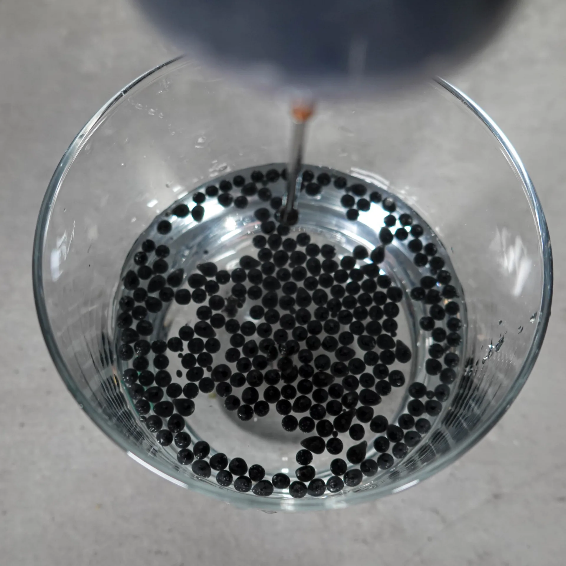 Encapsulation makes it possible to gel liquid ingredients in small spheres. Two components are essential for this: calcium chloride and alginate. So we bind our seaweed caviar with seaweed. For this purpose, we prepare a calcium chloride water bath consisting of 1l of water with and 9g of calcium chloride. We mix the water with a whisk. We dose the alginate with 5 g per liter. For this we take the seaweed stock and carefully mix in the powder with a blender. We let both liquids rest for 12 hours. This allows the calcium chloride to dissolve and the alginate to swell optimally. After the liquids are dissolved and swollen, we mix them by type with the blender. We lightly color our caviar broth with a plant ash, giving it an intense black hue. In terms of taste, the plant ash has no effect.