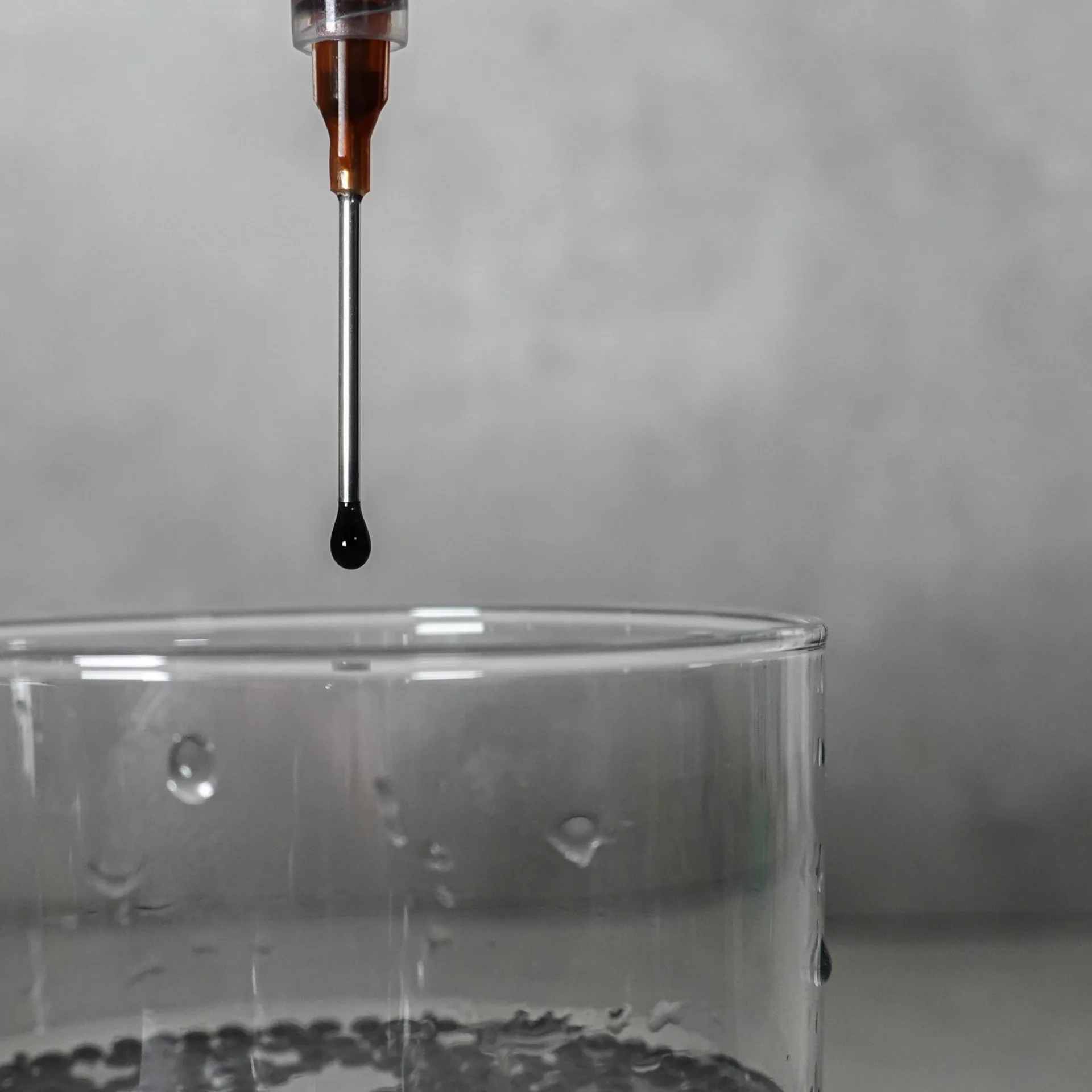 We now pour the seaweed stock into a syringe. This has a very thin cannula. We hold the cannula about 3 cm above the calcium chloride bath and allow drop by drop to slide into the water. In water, both liquids react and a thin membrane is formed, but the core remains liquid. Each caviar ball here is real handwork. We fish our caviar ball out of the water bath with a strainer and rinse it under cold water to stop gelation. Ready is the seaweed caviar Made by Milk.