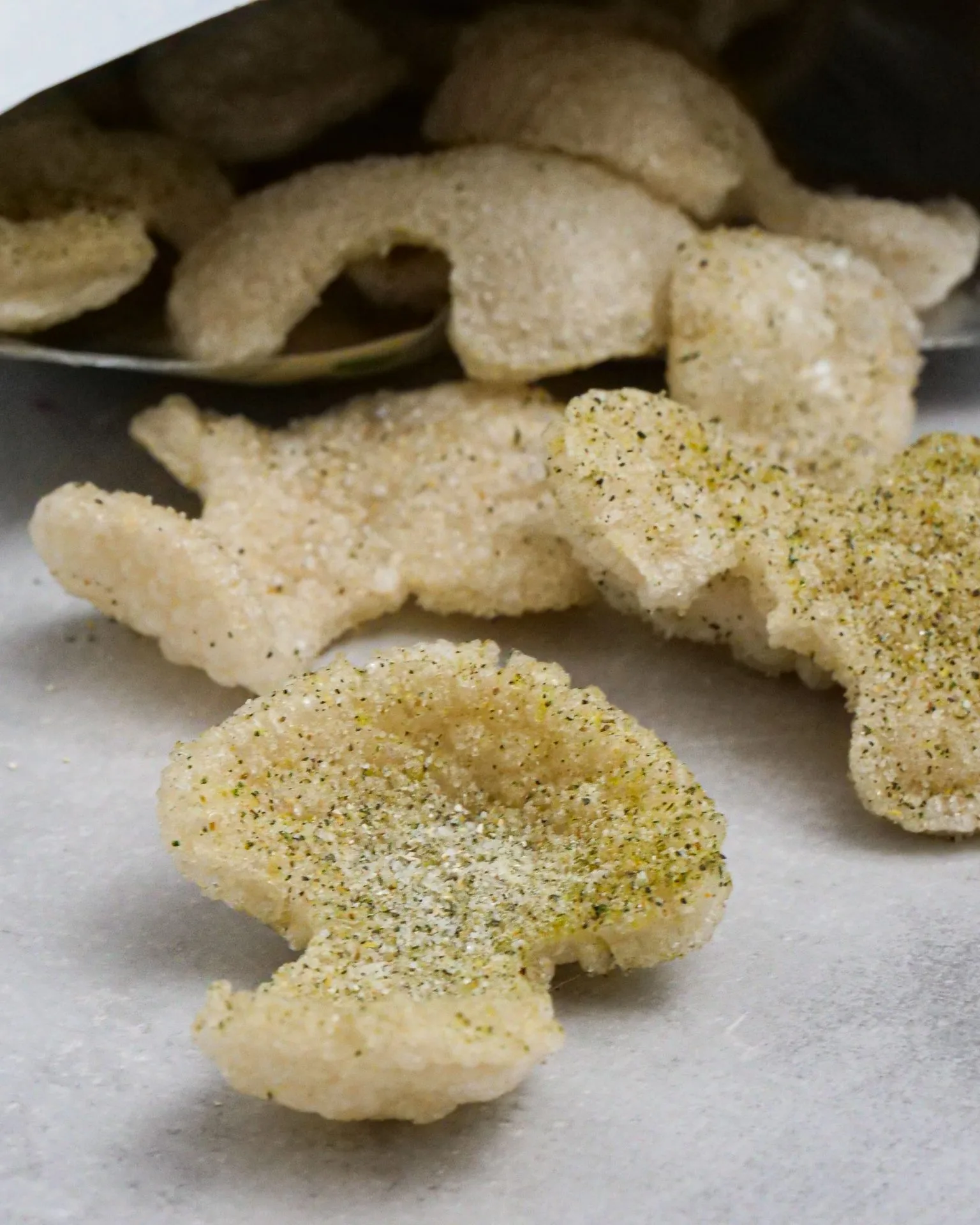 But now back to our mushroom snack. So the should not only convince with depth of flavor, but also visually remind you of snacks that are special in taste. Thus, through the appearance, we also enhance the taste of our snack. To do this, we make a mushroom snack based on starch. Like Krupuk (crab chips), the can be deep fried and when popped reminds one of the crispy crunchy Pork Rinds made from pork rind.