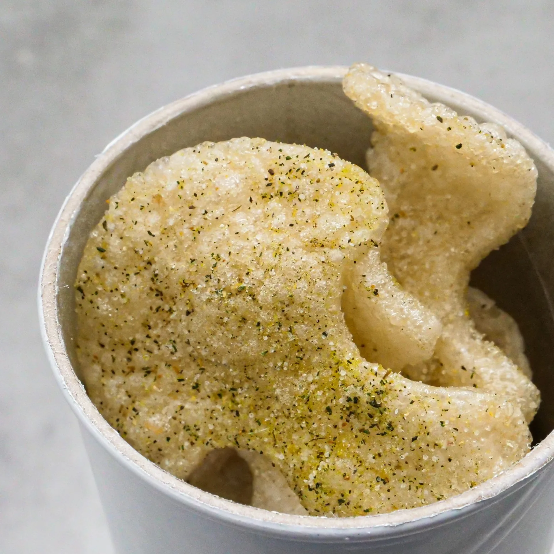 Finally, we have three different chips made from tapioca, glutinous rice flour and potato. Our favorite is the variant with the tapioca starch. Texture, mouthfeel and taste were convincing. The sticky rice unfortunately didn’t puff as well as the potato mushroom.