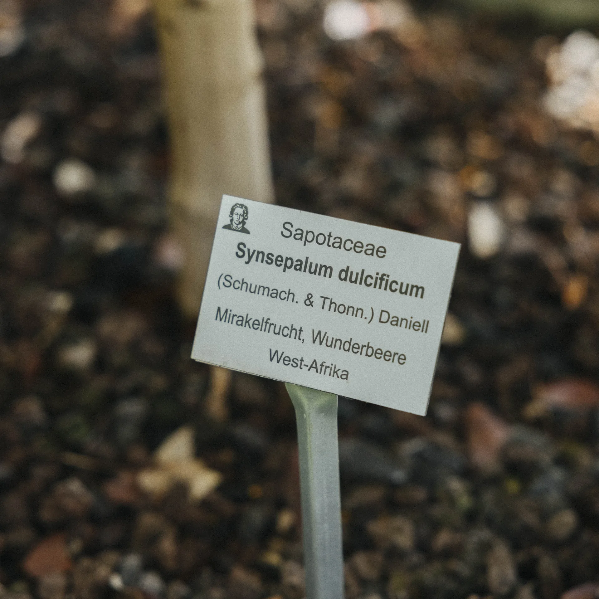 At the same time we found out that the miracle berry Synsepalum dulcificum (beautiful detailed photos by Jennifer Markwirth can be found on Flora Obscura) not only grows in Ghana, but also hangs just a few kilometers from our agency just ripe on the bush. Indeed, it is also cultivated in the Science Garden in Frankfurt. Of course we contacted them directly and visited the very beautiful garden including greenhouses. There we could enjoy the berry fresh from the bush and then get to know the sweet side of vinegar and lemon. The miracle berry is truly impressive and we look forward to a variety of equally impressive products, our fruit leather is just a first idea.