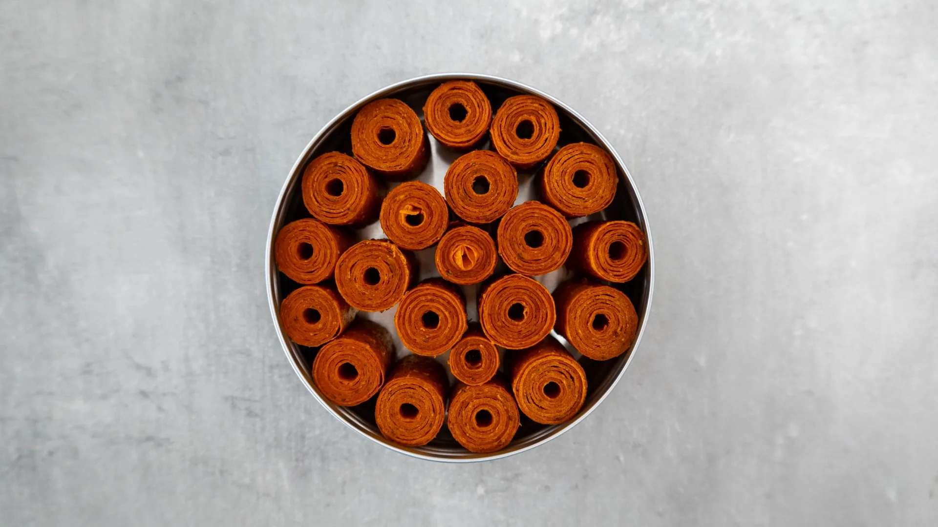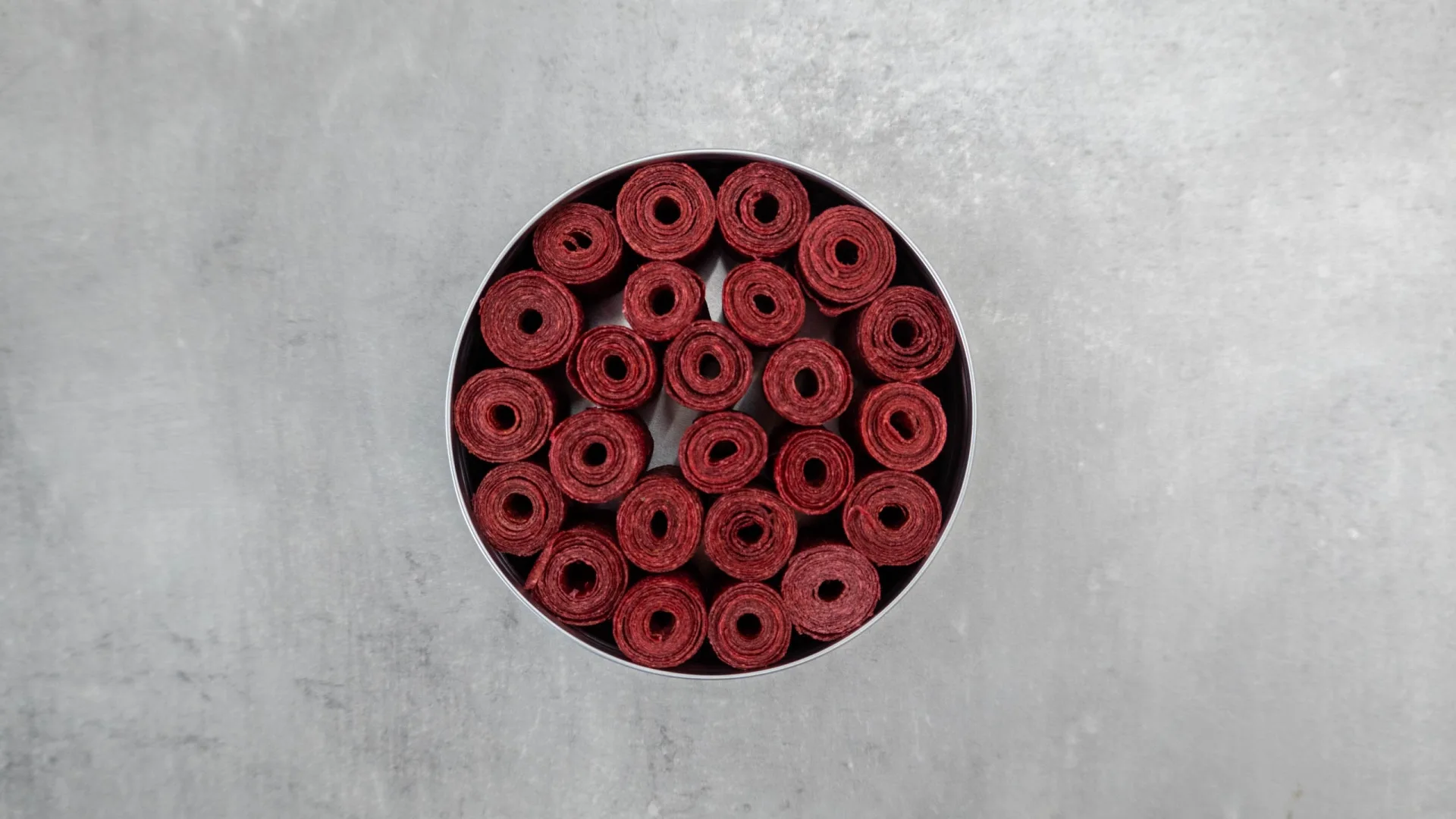 We produce our fruit leather conventionally: cranberries, sea buckthorn and rhubarb are washed, crushed and pureed. Then painted on mats and dried. However, the basic mass is supplemented with some powder of Miracle Berry, which itself, by the way, is rich in antioxidants – so we add a little more superpower to our superfoods. So we can do without sweet fruits as a base, each piece of fruit leather contains the full power of the acidic superfoods and only a little of the fruit’s own sugar.