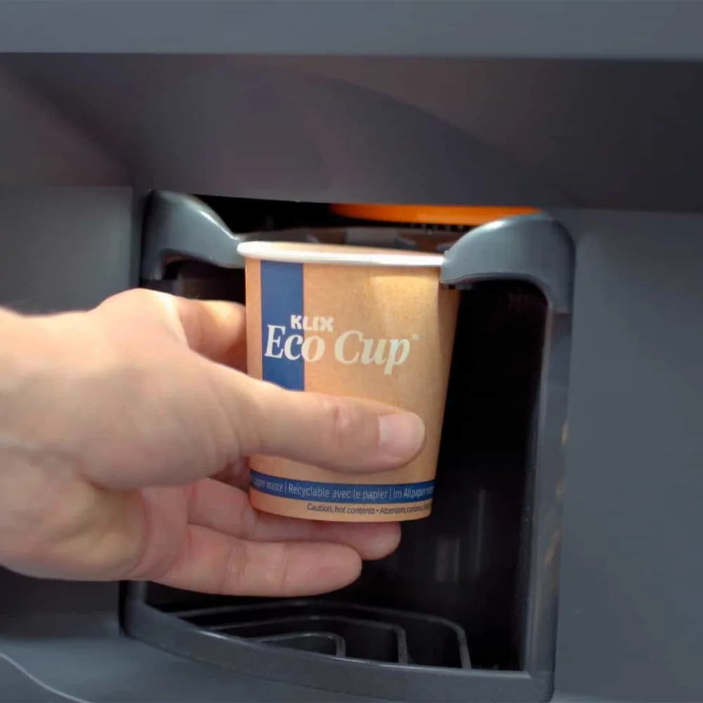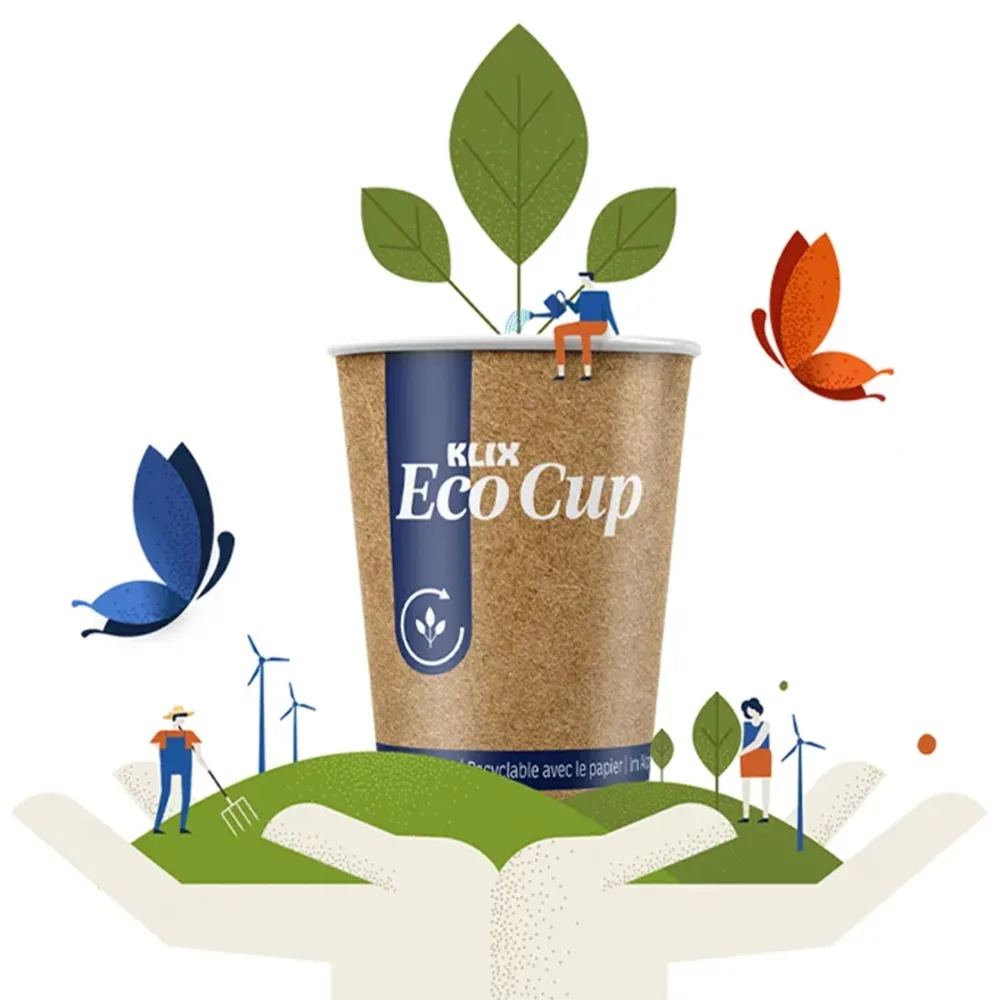 KLIX Eco Cup are crafted from paper, fully recyclable, compostable, and entirely free of plastic. As a sustainable alternative to plastic cups, it is designed to minimize their ecological footprint. Being fully recyclable means no PE coatings or other plastics coatings are present. The PEFC certified paper cups are of high quality raw material and can be disposed of in regular paper recycling streams. Cups can be reused up to seven times in the recycling process and reused for other paper products such as paper packaging and newspapers.