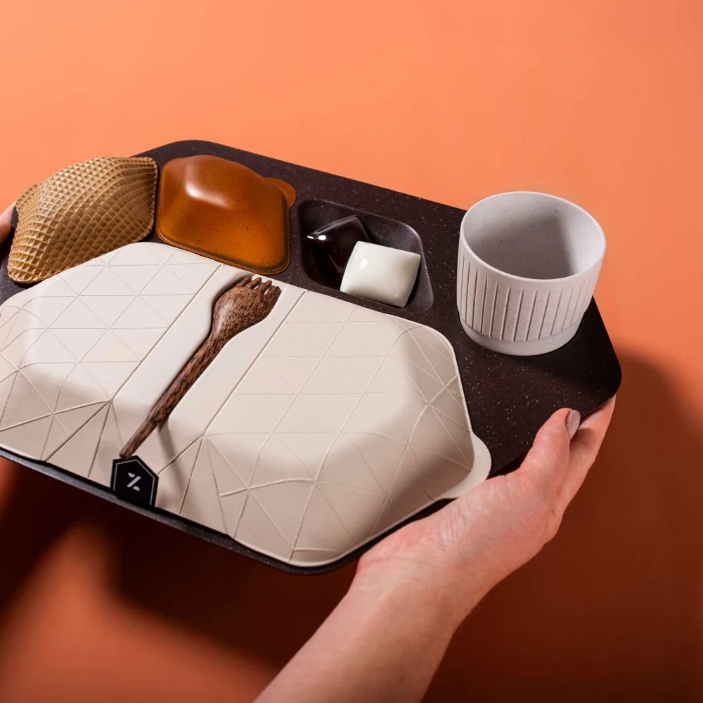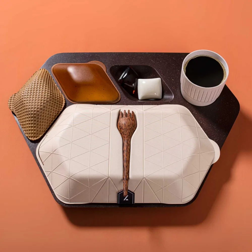 The concept for sustainable in-flight catering includes the following natural ingredients: Coffee grounds and husks (tray, washable and reusable), wheat bran (meal trays, washable and reusable), seaweed or banana leaf (lid for side dish), edible wafer (dessert lid), coconut wood (cutlery, (cutlery, washable and reusable), dissolvable seaweed film (capsules for sauces and milk), rice husks with PLA binder (outer cup, washable and reusable), seaweed film (inner cup), bamboo (main course lid). The latter is designed in such a way that it can be folded up to hold all waste. This allows them to be disposed of efficiently and composted whole.