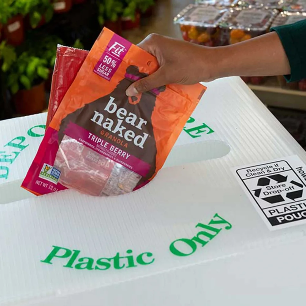 The Bear Naked brand granola, a product of the Kellogg Company, produces a fully recyclable stand-up pouch. The aim was not only to produce a recyclable pouch, but also to achieve efficient production while maintaining a consistent customer experience. Although this packaging is light and thin, there are actually many layers of material used in the production of films for flexible pouches. In order for flexible packaging to be fully recyclable, a polyethylene film from a single cast is required.