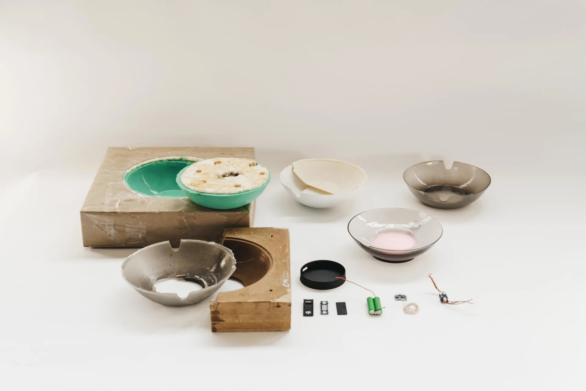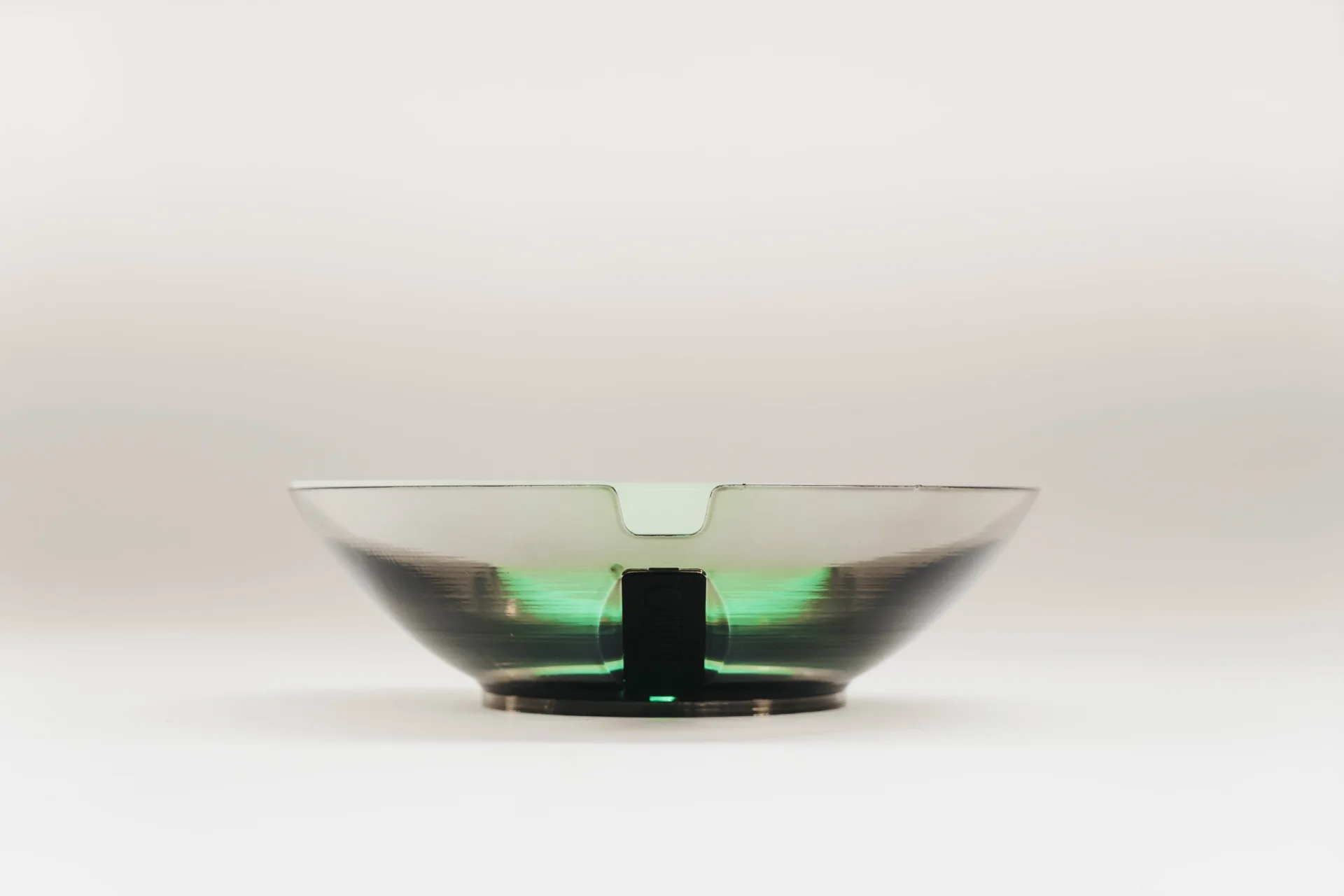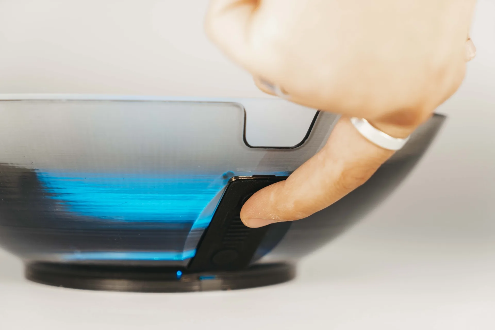 Der Teller besteht aus zwei Teilen. Im unteren Teil aus Kunststoff befindet sich die Elektronik sowie die Bedienelemente. Am Rand sind zwei Touchpoints angebracht. Mit dem einen Touchpoint kann die Helligkeit reguliert werden. Mit dem zweiten Touchelement kann die gewünschte Farbe eingestellt werden. Der obere Teil, bestehend aus Glas, ist abnehmbar. Somit kann er gut wieder gereinigt werden.