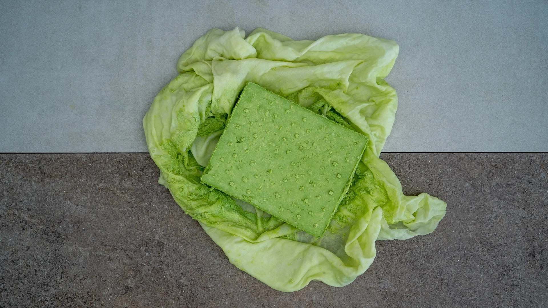 Sojabohnen wieder waschen und winweichen, dieses Mal aber nicht kaltpressen, sondern mixen, sofort aufkochen und die Masse für 10-15 Minuten köcheln. Anschließendem abseihen durch das Passiertuch und Sojamilch Auffangen. Der Sojamilch bei ca. 75 ° C das in heißem Wasser aufgelöste Gerinnungsmittel zugeben. 15-20 Minuten warten und das geflockte Protein abseihen und zurück in den gereinigten Topf geben. Den grünen Saft dazugeben und mit 5 g Salz einrühren. Anschließend im Passiertuch abtropfen, pressen, in die Tofu Form geben und kaltstellen. Die Molke aufheben und anderweitig verwenden (z.B. mit einem Saft mischen und im Home Office genießen)