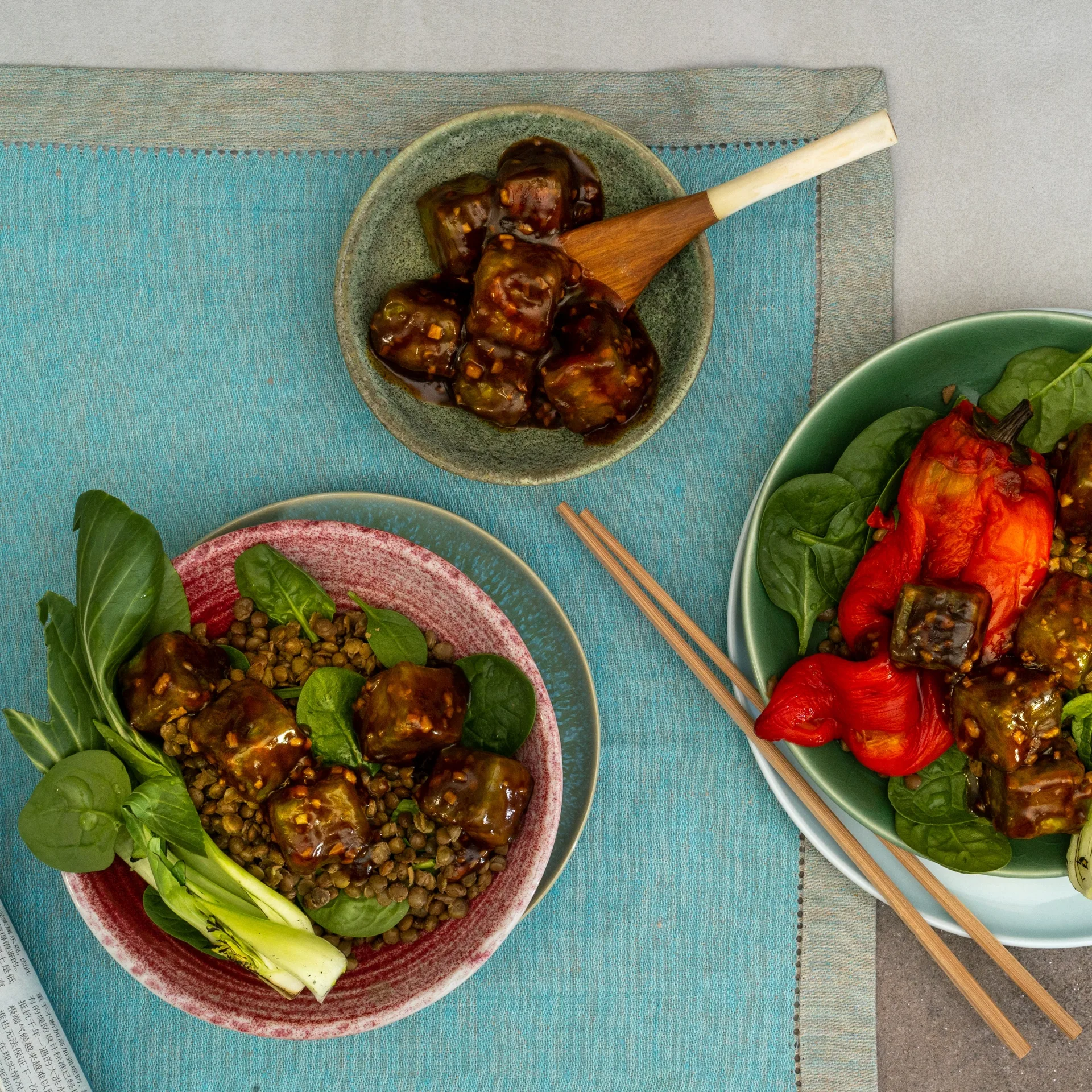 Grüner Tofu süß-sauer auf Linsen mit Baby Spinat