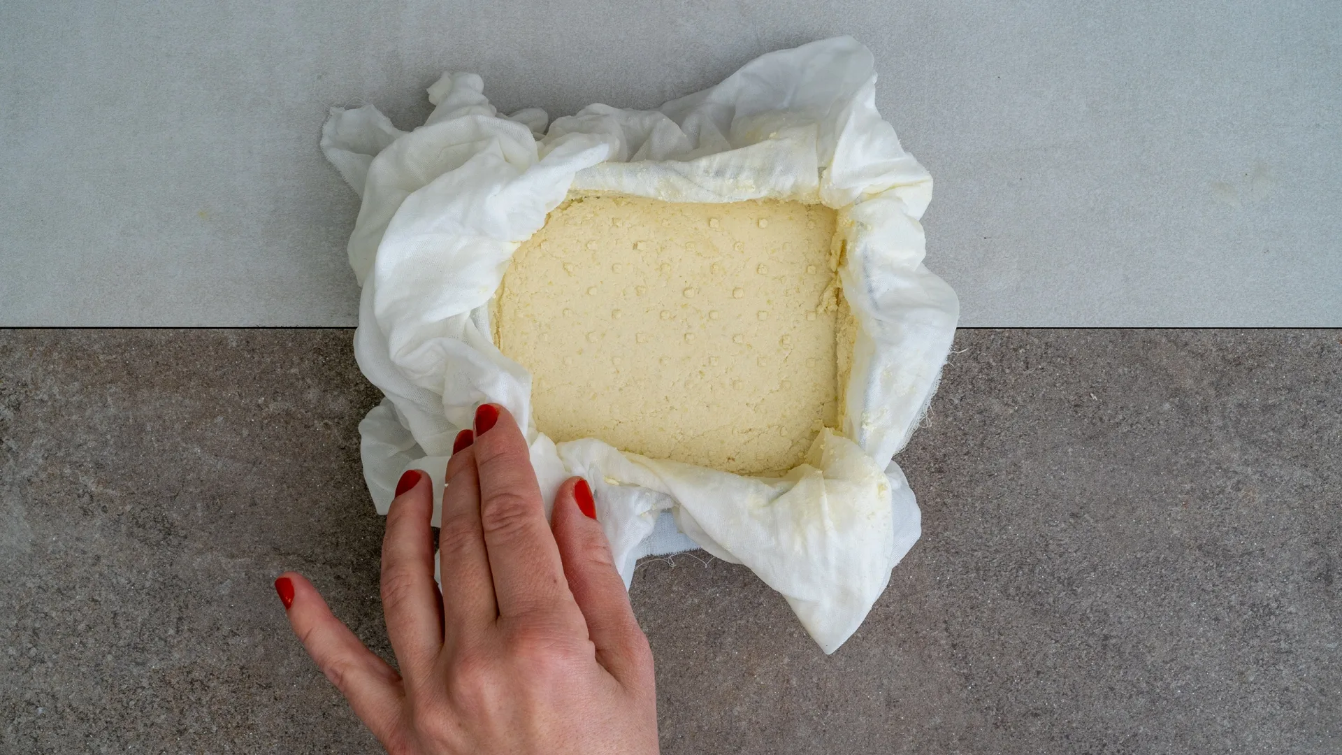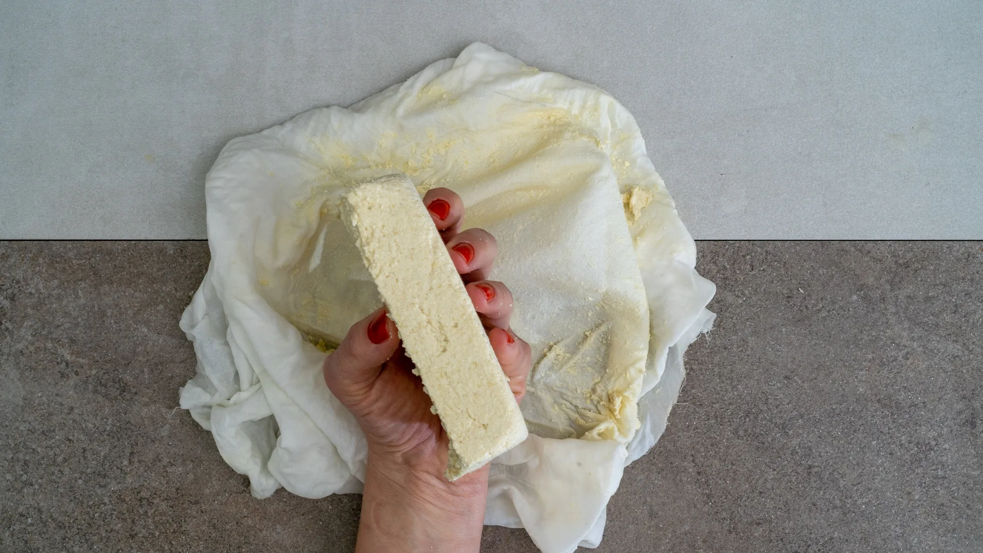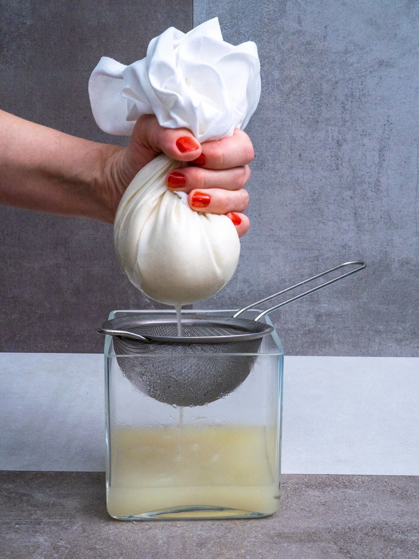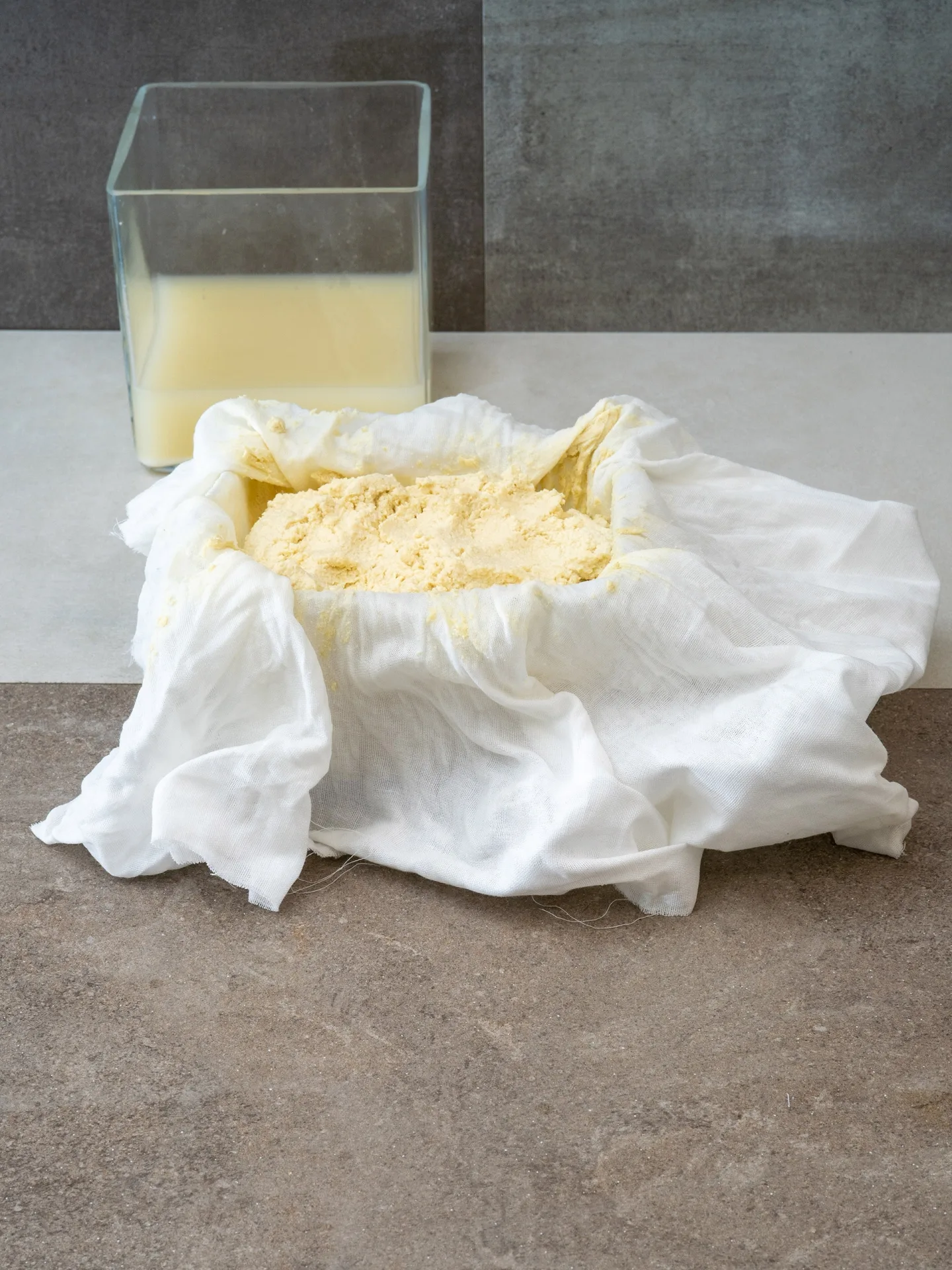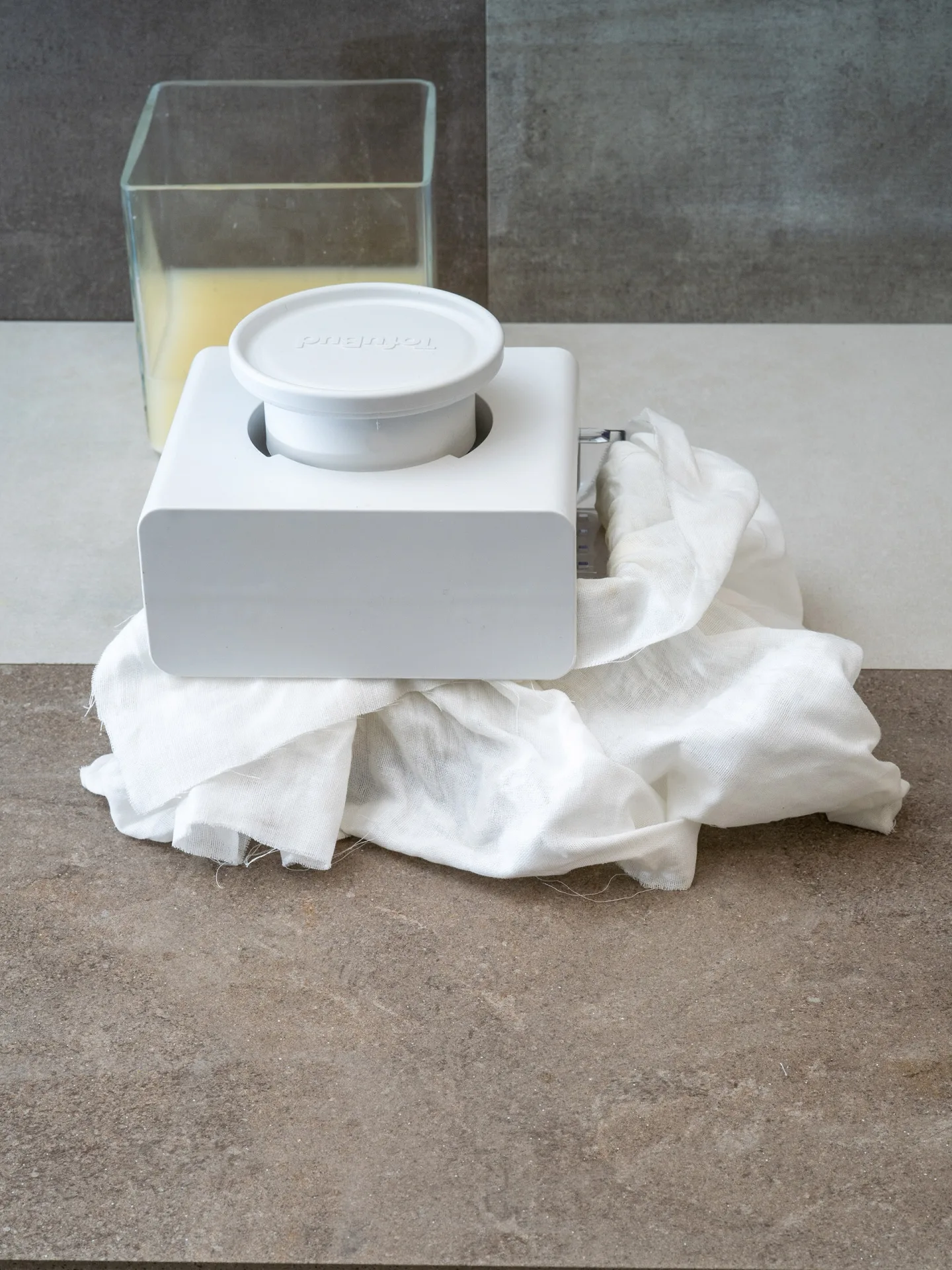 Die Sojamilch wird nun aufgekocht und für 10 Minuten geköchelt. Auf alle Fälle dabeibleiben und so oft es geht rühren, damit nichts anbrennt. Währenddessen 15 g Nigari in etwas heißem Wasser auflösen. Die heiße Sojamilch auf 75 °C abkühlen und das gelöste Nigari einrühren. Dabei wird das Ausflocken sofort ersichtlich. Vom Herd ziehen, abdecken und 15-20 Minuten abwarten. Durch das Gerinnungsmittel stockt das Protein der Sojamilch. Die Molke trennt sich so vom Eiweiß. Das Geronnene in das Passiertuch füllen, abtropfen, auswringen, in eine Sojapresse geben, pressen und kaltstellen.